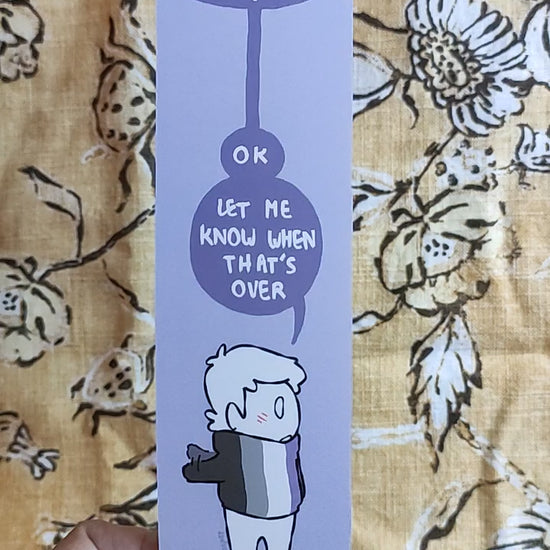 Double-sided bookmark, asexual on one side and aromantic on the other (see video), 5x19cm with rounded edges, featuring an original character. Originally produced as a promotional item for the "No One Can Know I Don't Like Sex" comics by AkhtsJrep.